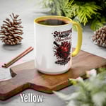 This custom two-tone mug is here to accommodate all your favorite pick-me-up elixirs in style. Its durable ceramic build is microwave & dishwasher safe, as is any printing that goes on to these mugs. It holds 15oz and comes in three different color schemes: white with red interior, white with pink interior, and white with black interior.